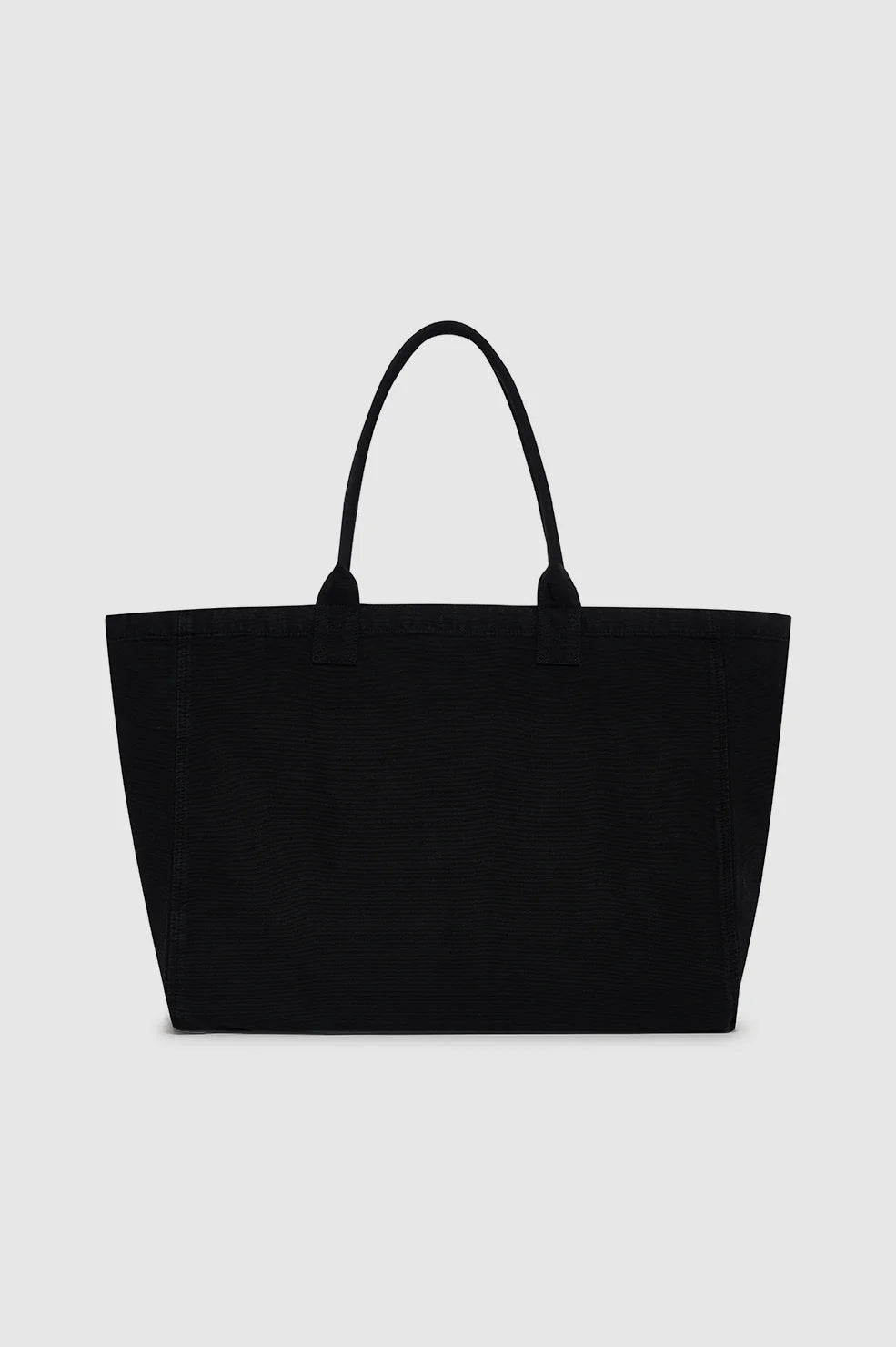 An unlined canvas tote bag featuring an all-over black and screen-printed ANINE BING branding in contrast white.
