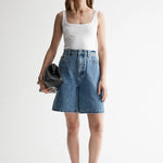 Our best-selling jeans in a summer style, the Odin Short is our new denim staple. Made of 100% cotton in our Trinity Blue wash, the Odin Jean is cut to a high waisted fit with button and zip fly, classic 5-pocket styling, and a relaxed, wide leg silhouette. Sitting just above the knee, the Odin Short pairs perfectly with our range of premium basics.