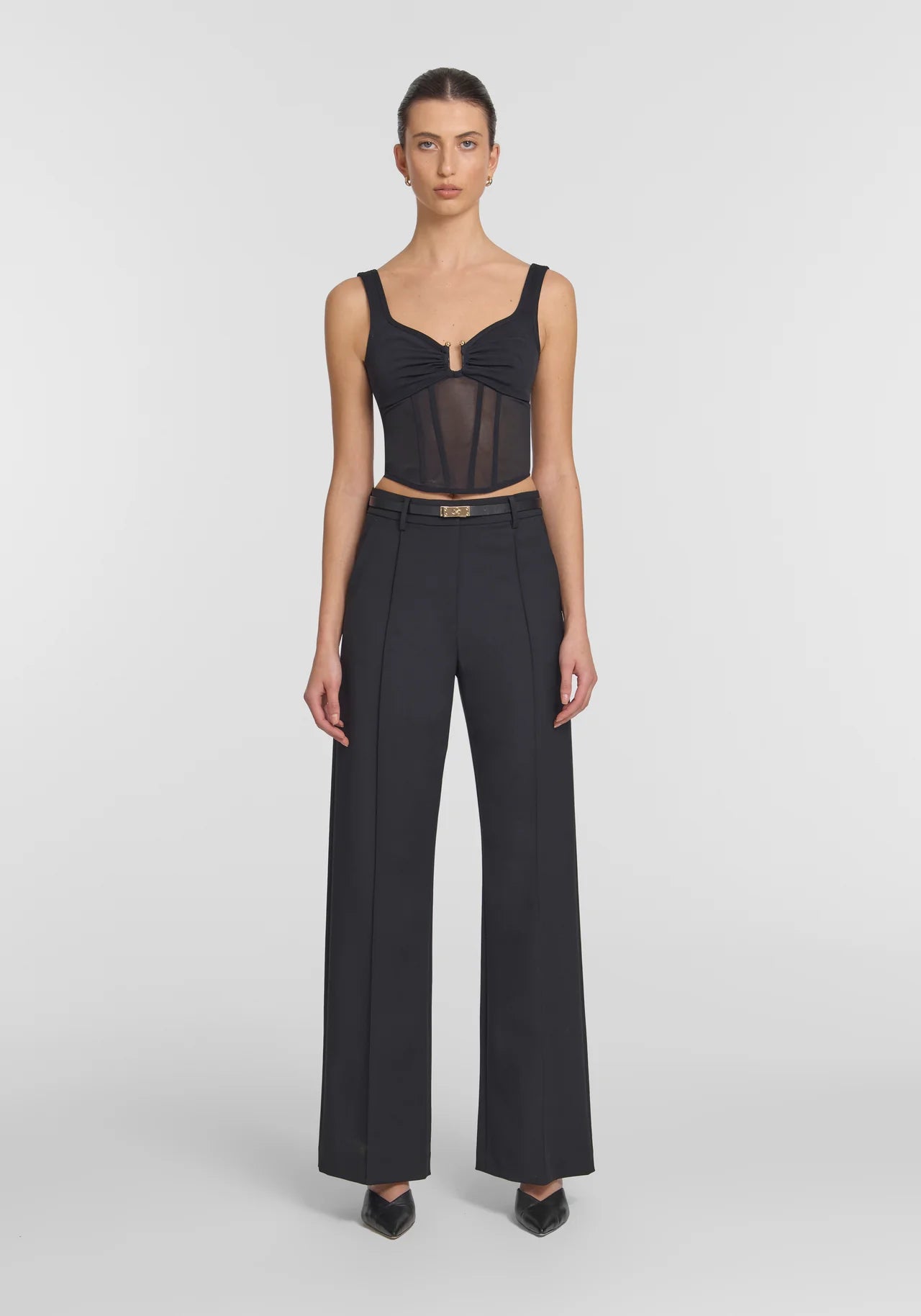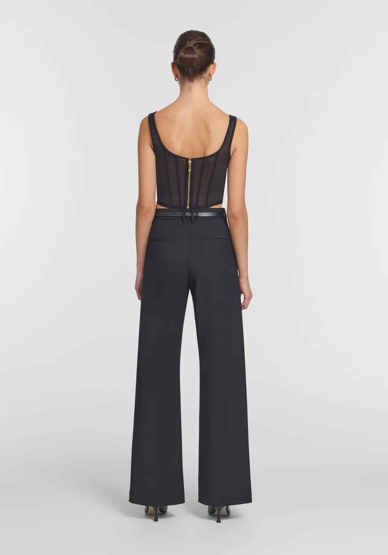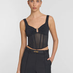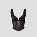 A V&W mainstay, the Spellbound Bustier extends the powermesh narrative in timeless black. Featuring a sweetheart neckline, paneled boning and metal stud detailing at the centre front, it marries femininity with edge - making it the perfect top for an event or night out.