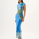 Introducing the Joyce Dress, crafted in our exclusive Moonlit Lily print. Rendered in a soft, flattering mesh fabrication, The Joyce Dress features an asymmetrical neckline and a cinched waist that evolves into an ankle-grazer length silhouette.