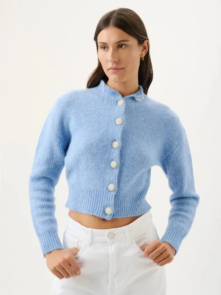 Effortlessly chic and endlessly versatile, the Matteo Sweater in a Bluebell hue is designed for repeat wear with its refined sophistication. It features elegant beaded button detailing, a slightly cropped silhouette, and finished with ribbed cuffs and hem.