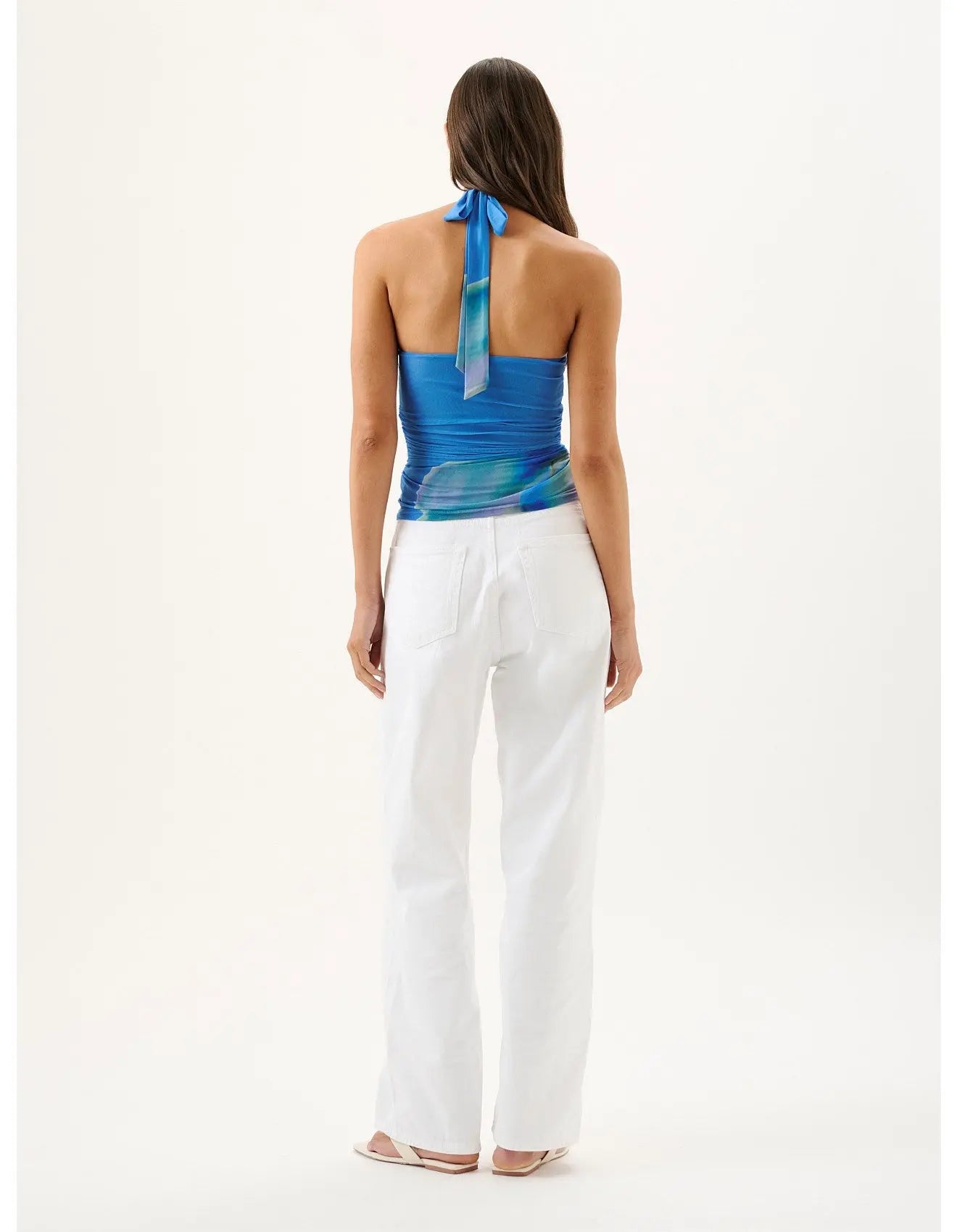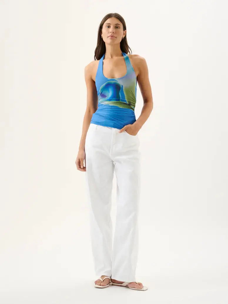 Elevate your wardrobe with the Thea Top in our exclusive Moonlit Lily print. A flattering scoop neckline, ruched waist, and halter tie detail create a modern feminine silhouette.