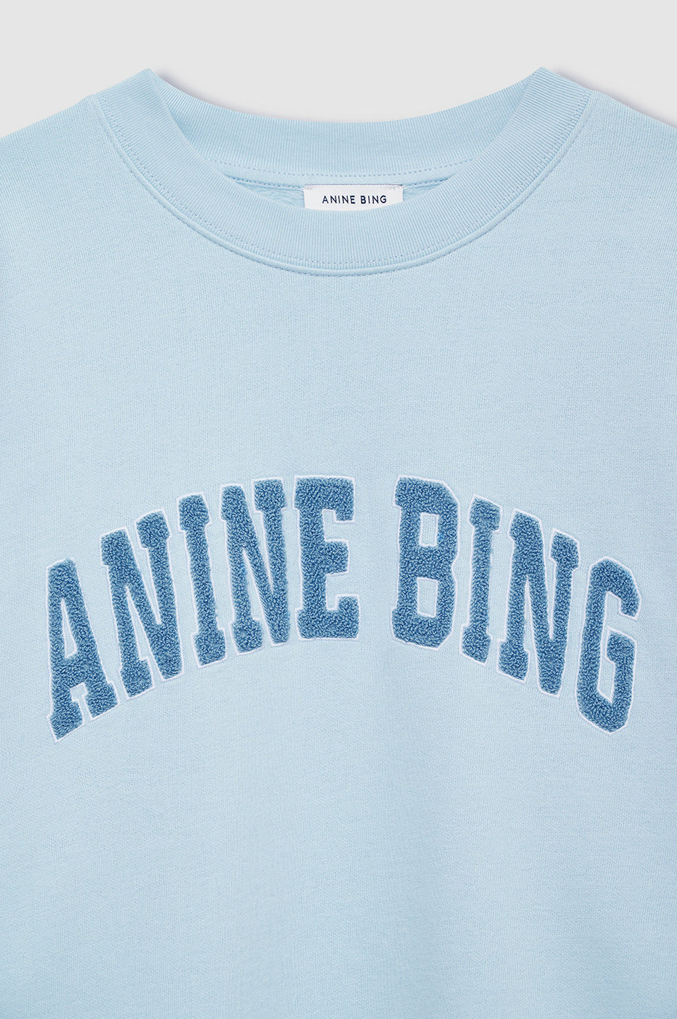 An oversized crewneck pullover made from midweight 100% cotton fleece in pale blue that's brushed on the inside.
