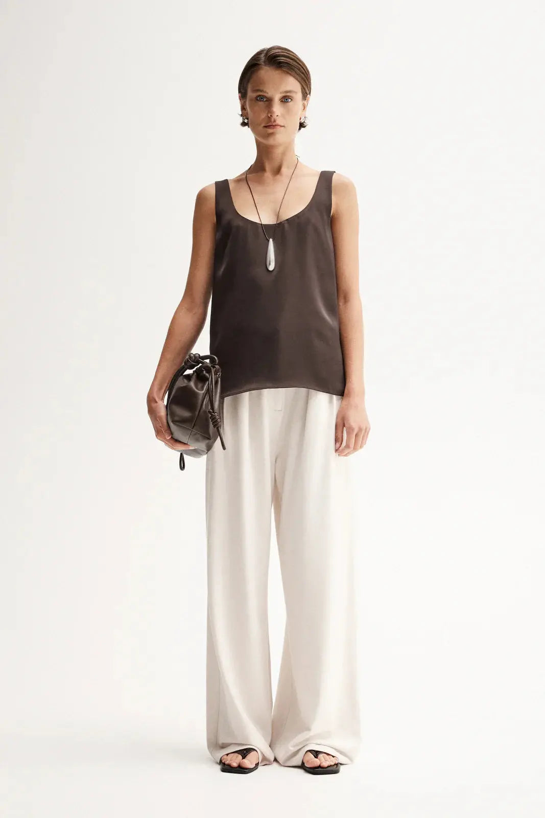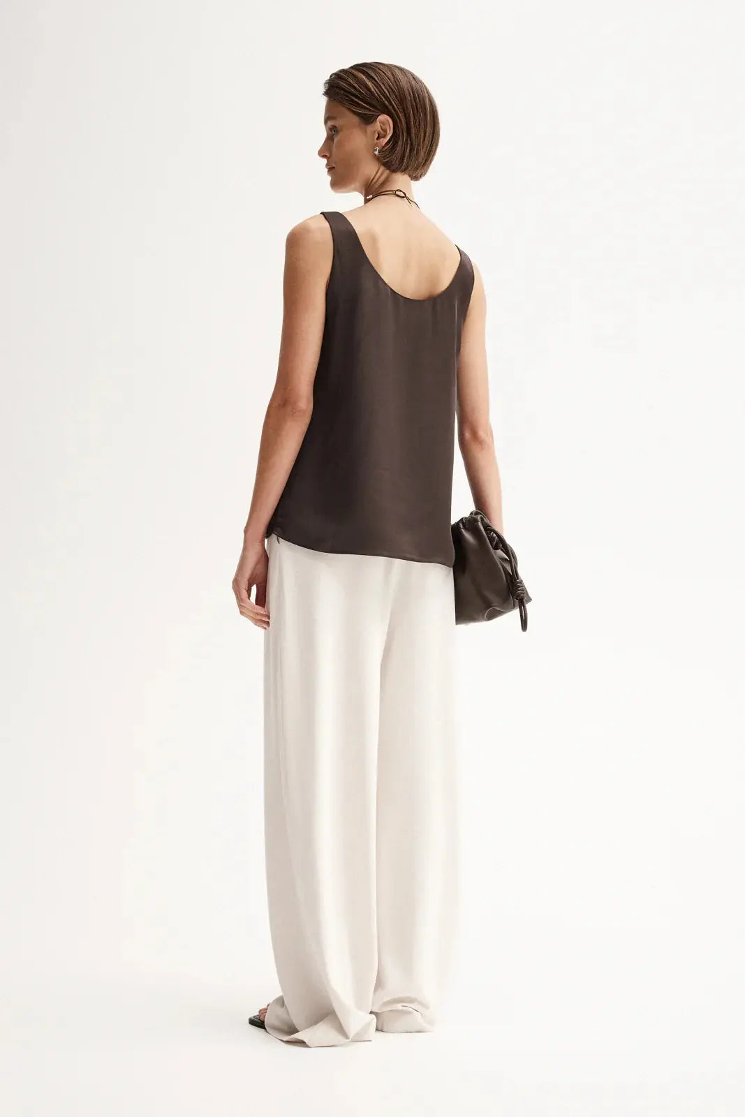 The Mina Tank is a true elevated basic. Made of a luxuriously soft recycled Japanese satin, this top is cut to a relaxed fit with a low scoop neckline. Style for day to night outfitting with soft tailored pants or coordinate with the Mina Maxi Skirt.