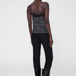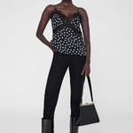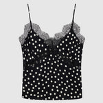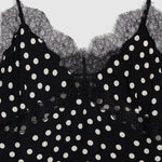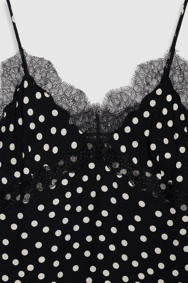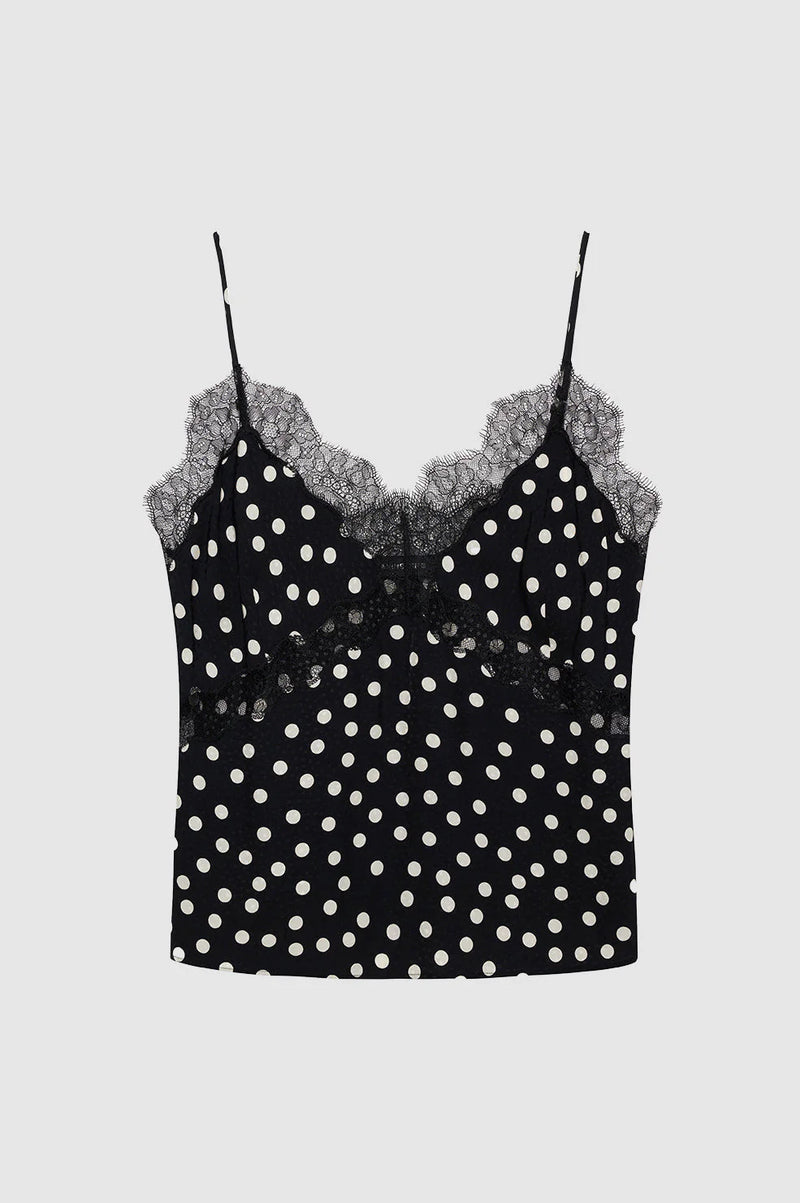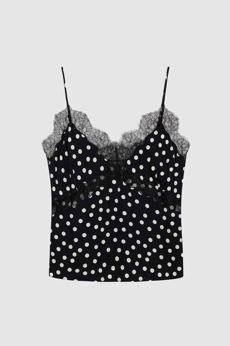The Amelie Camisole is a day-to-night piece crafted from a lightweight, double-dot jacquard fabric with lace trimming at the top.