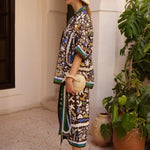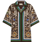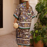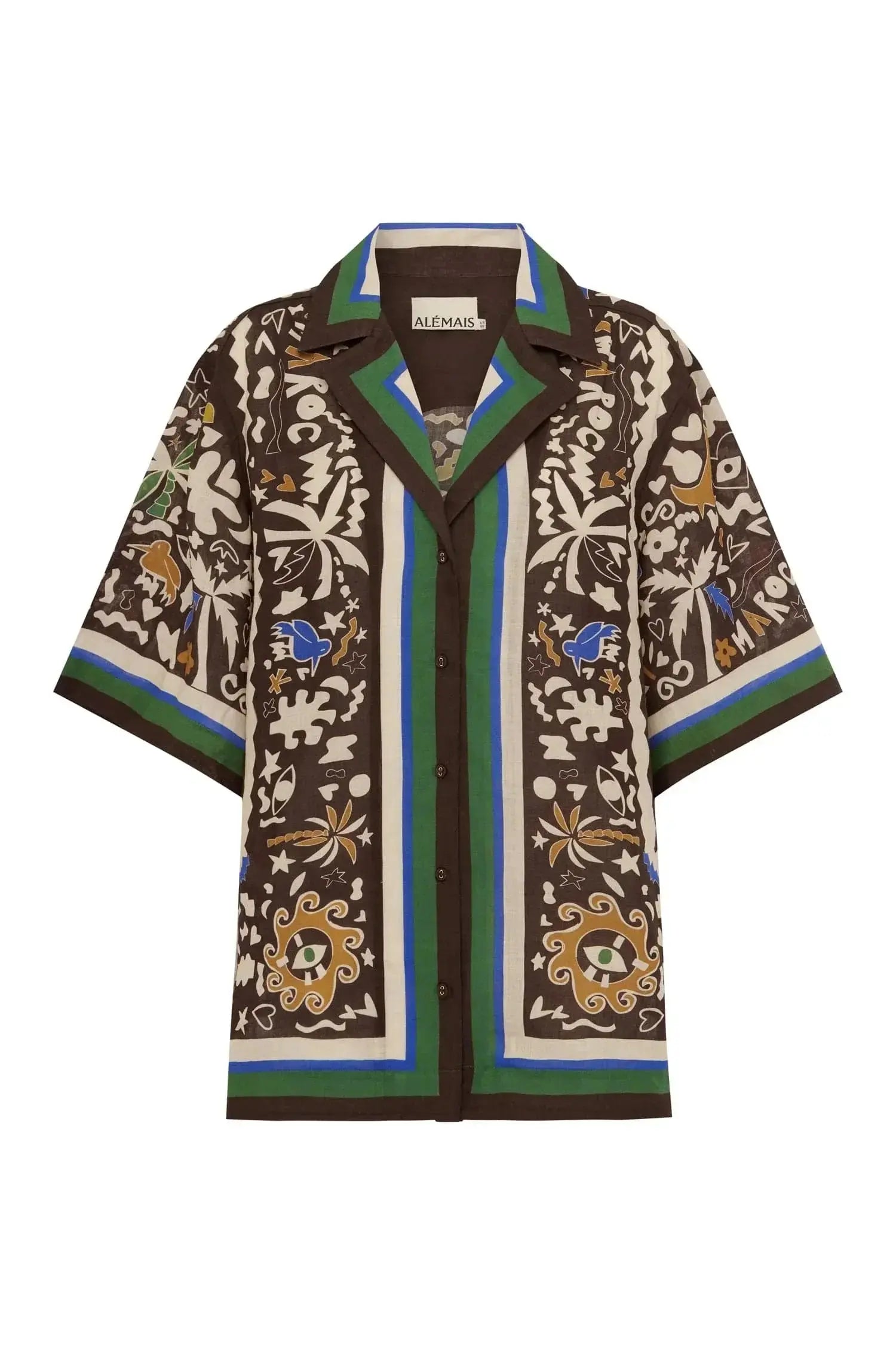 Introducing Alemais's Maroc Relaxed Shirt, a button-up camp-collared t-shirt silhouette in a floral and leafy print. The print features hand-drawn, abstract motifs inspired by Moroccan landscapes and artisanal symbolism. Comprising playful shapes, stars, florals, and organic forms, it’s rendered in earthy brown and ivory tones.