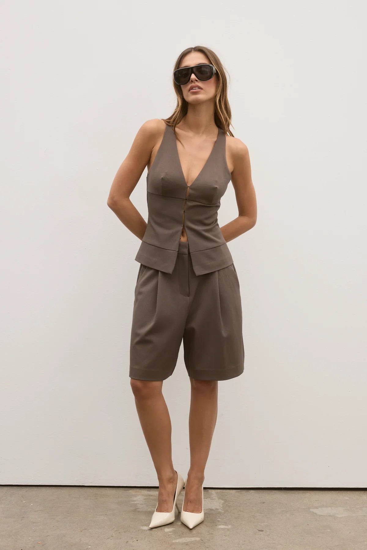 Modern and refined, the Reeve Halter Top features a deep V-neckline and sleek halter silhouette that highlights the shoulders. Designed with tailored seam detailing and subtle front closures, this piece offers a structured yet minimal look. Pair it with the matching Mika Short for an effortlessly polished set.