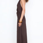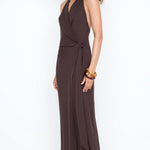 Soneva Wrap Dress in Dark Chocolate. Discover our timeless best-seller blending a chic halter neckline with a graceful low-waist tie, ideal for an unforgettable wedding guest dress, parties and formal events.